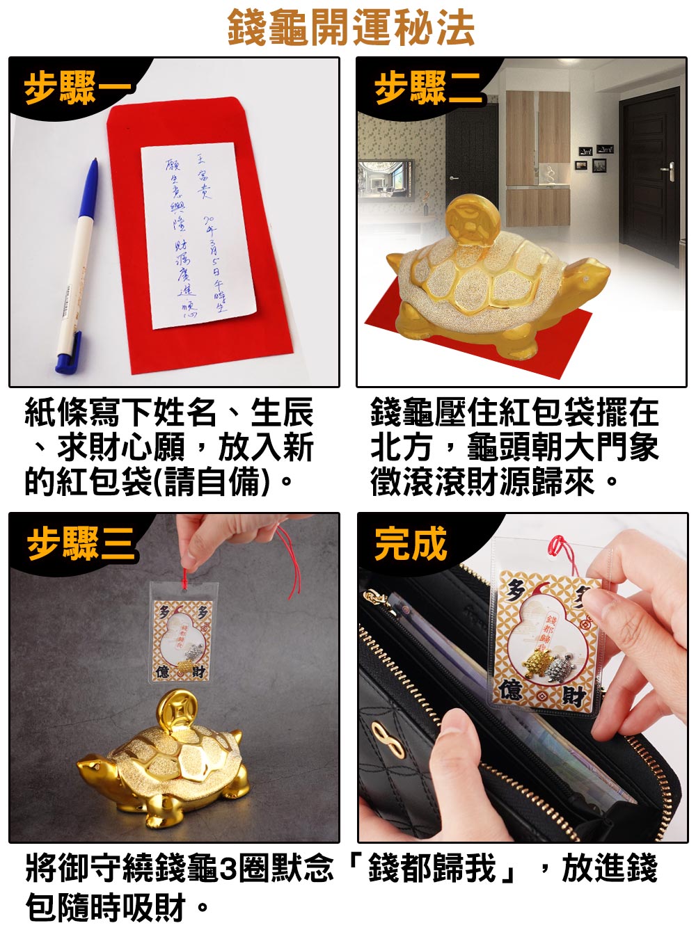 步驟二:錢龜壓住紅包袋擺在北方,龜頭朝大門象徵滾滾財源歸來。